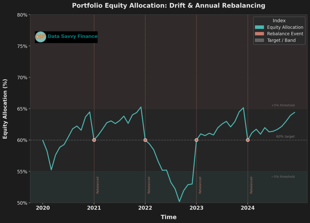 More importantly, rebalancing keeps your risk profile where you intended it to be. Without it, a growth-oriented market run can silently push a balanced investor into a growth investor’s risk exposure, which only becomes obvious when the next market correction hits.